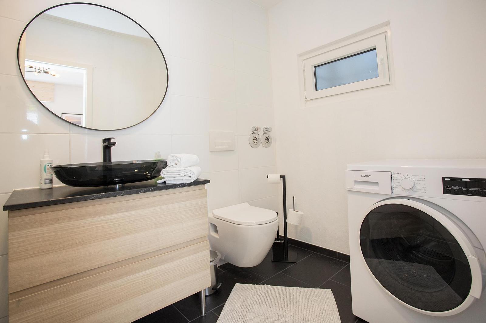 De badkamer is uitgerust met een wastafel met opbergmeubel en spiegel, een douchecabine, toilet en een wasmachine/droger combinatie, zodat je ook tijdens je vakantie een wasje kunt draaien.