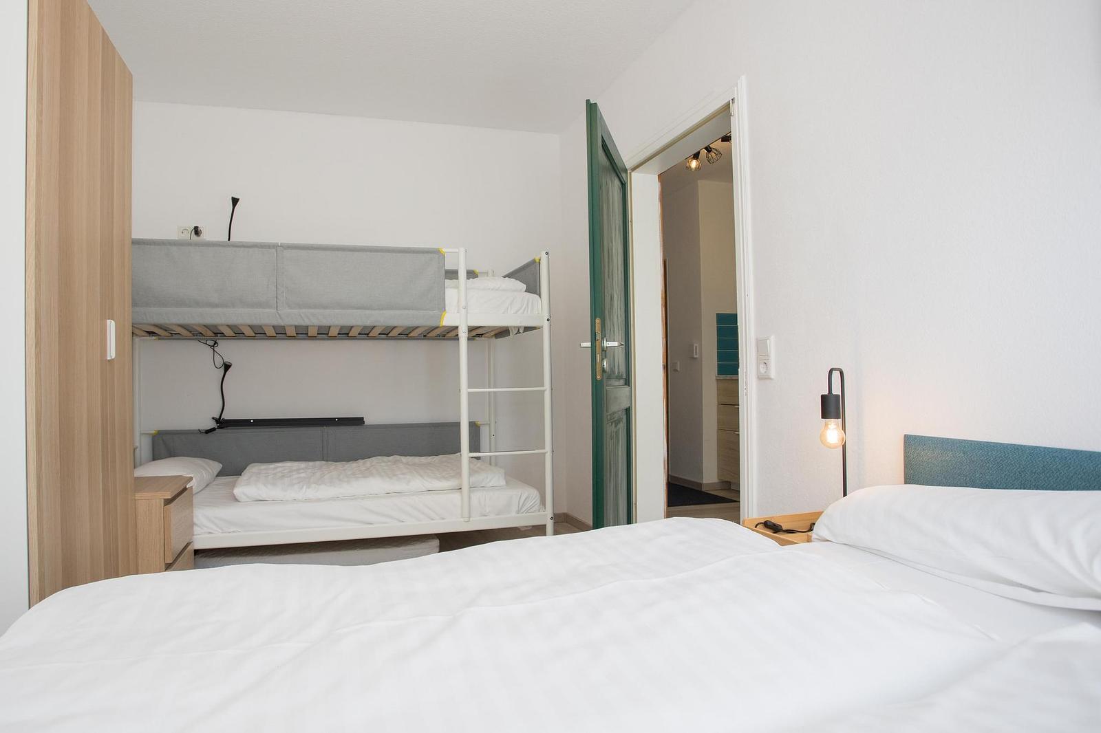 In de slaapkamer staat een tweepersoonsbed (140x200 cm) en een stapelbed met twee matrassen (90x200 cm). Je slaapt in deze accommodatie dus met zijn vieren op een kamer. Verder zijn er nachtkastjes, bed verlichting en een kledingkast voor het opbergen van bagage. Onder het bed vind je twee lades met extra opbergruimte.