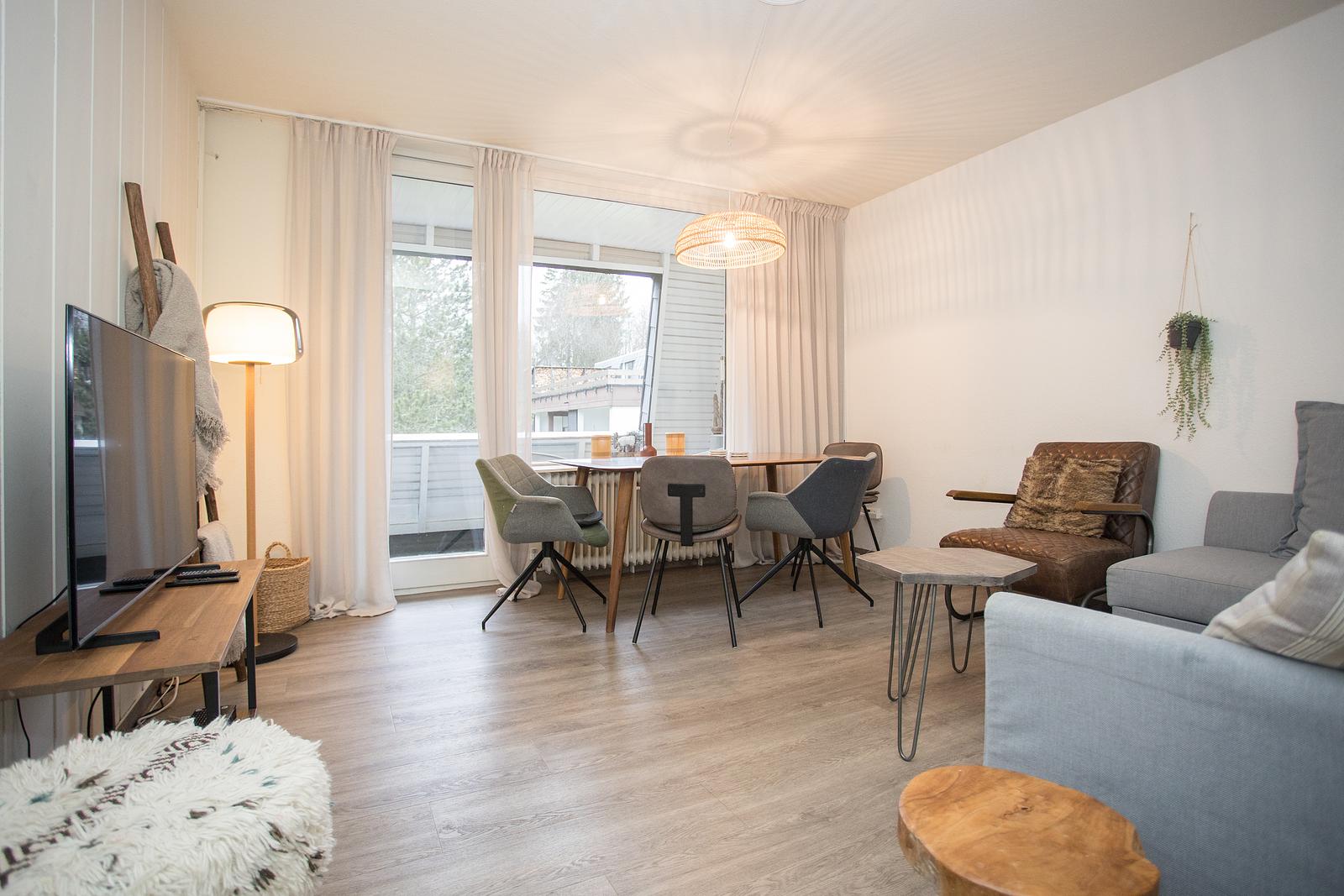 Meteen bij binnenkomst voel je je thuis in dit moderne en gezellig ingerichte appartement. In de woonkamer kun je relaxen op de loungebank en genieten van het uitzicht. Tevens kan je op de twee grote balkons aan de voor- en achterkant heerlijk zitten. De ruime keuken is van alle gemakken voorzien om er de lekkerste gerechten te bereiden. De twee slaapkamers hebben comfortabele bedden [160 x 200 en 180 x 200] en voorzien van toppers. Er zijn twee badkamers, één met toilet, wastafel en douche, de andere met toilet, wastafel en ligbad. Bij het appartement hoort het gratis gebruik van het luxe inpandige zwembad en het gebruik (tegen vergoeding) van de sauna. Gratis Wifi, ruim voldoende parkeergelegenheid. Rustig gelegen direct in het bos (wandelpaden) en naast de Golfbaan. Mooi overdekt zwembad en sauna (€ 2,00 per keer).