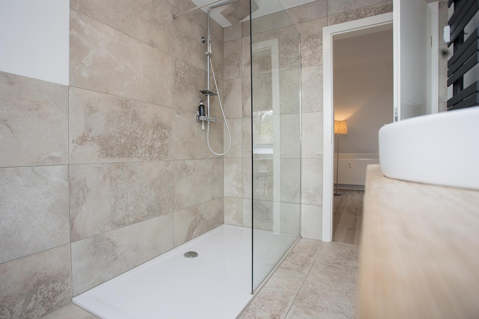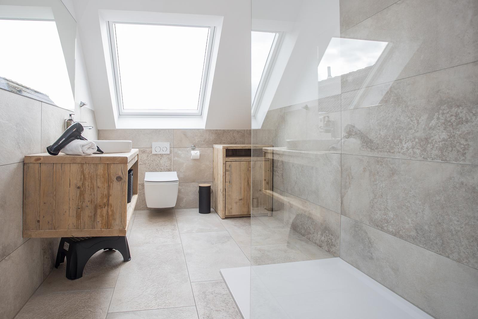 De moderne badkamer is uitgerust met een ruime regendouche, een wastafel met opbergruimte, een toilet en een handige haardroger.